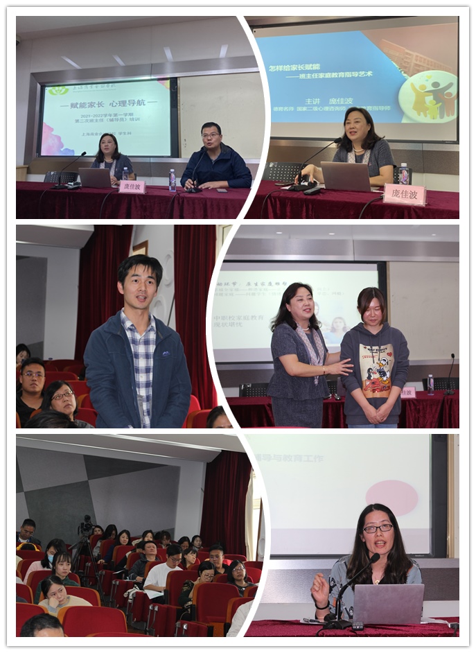 2021年10月26日下午14:00,在黄浦校区1号楼401阶梯教室举行了本学期第二次班主任培训,学校19、20、21级全体班主任、辅导员和各教学部学工主任参加了本次培训。此次培训的主题是“赋能家长 心理导航”, 培训由“清荷”班主任工作室主持人、学生科杨春平老师主持。