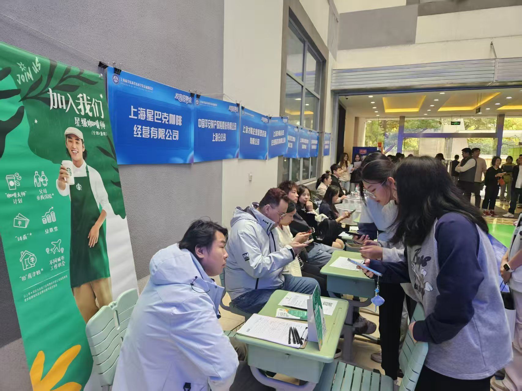 上海商学院高等技术学院交通路院区10号楼一楼大厅内人头攒动,气氛热烈。由院区主办的 “2026届毕业生秋季校园招聘会” 在此如期举行,二十余家与院区专业高度契合的知名企业汇聚一堂,为应届毕业生们搭建起一座从校园直通职场双向选择的桥梁。