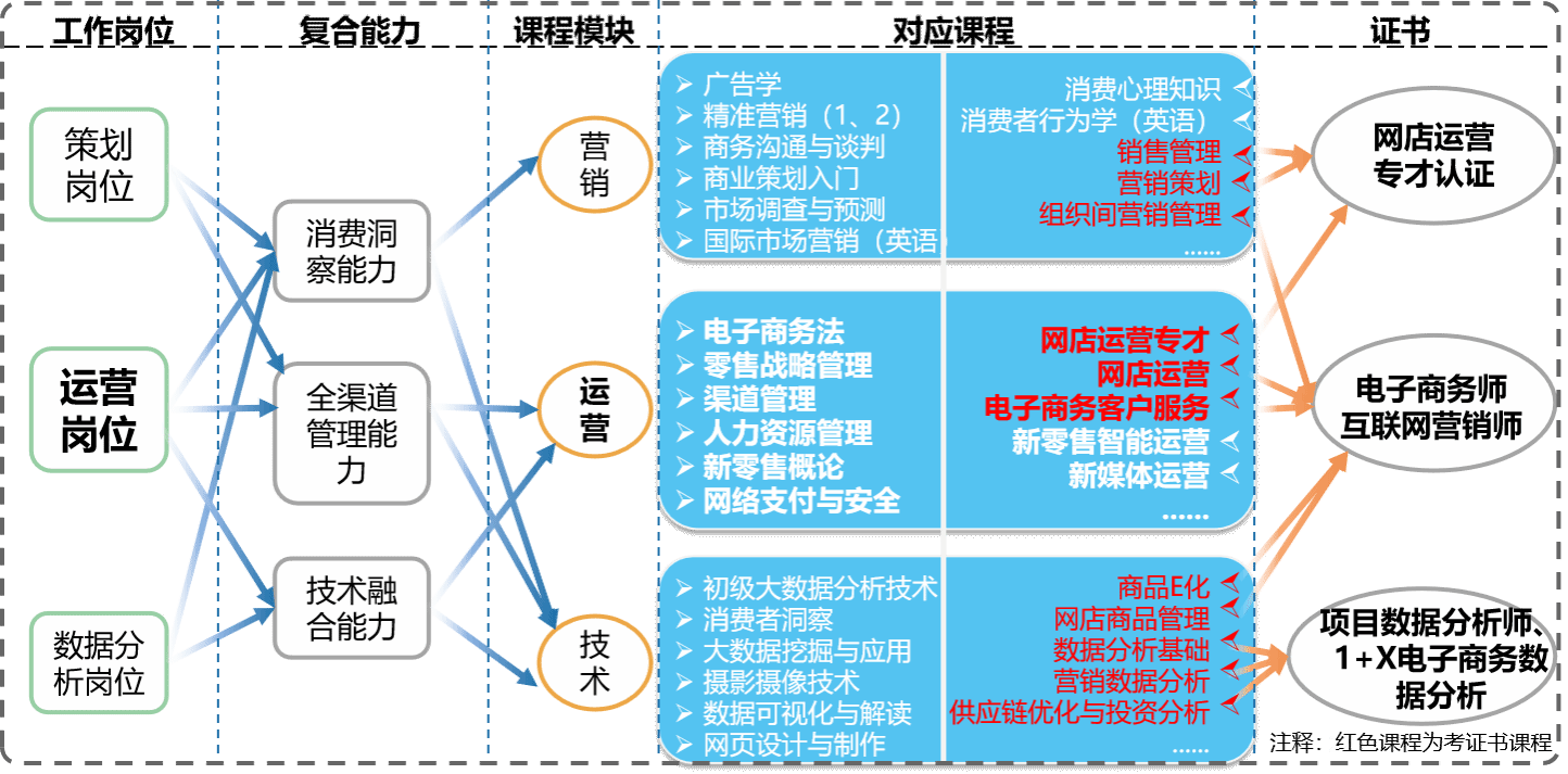 专业课:电子商务、电子商务运营、商品E化、新零售智能运营、新媒体运营、电子商务数据分析、互联网营销、数据可视化与分析、市场调查与预测、消费者行为学(全英课)、国际市场营销(全英课)、精准营销、整合营销传播、数字化营销、大数据挖掘与应用、商务数据管理、品牌战略管理、采购与供应链管理等。