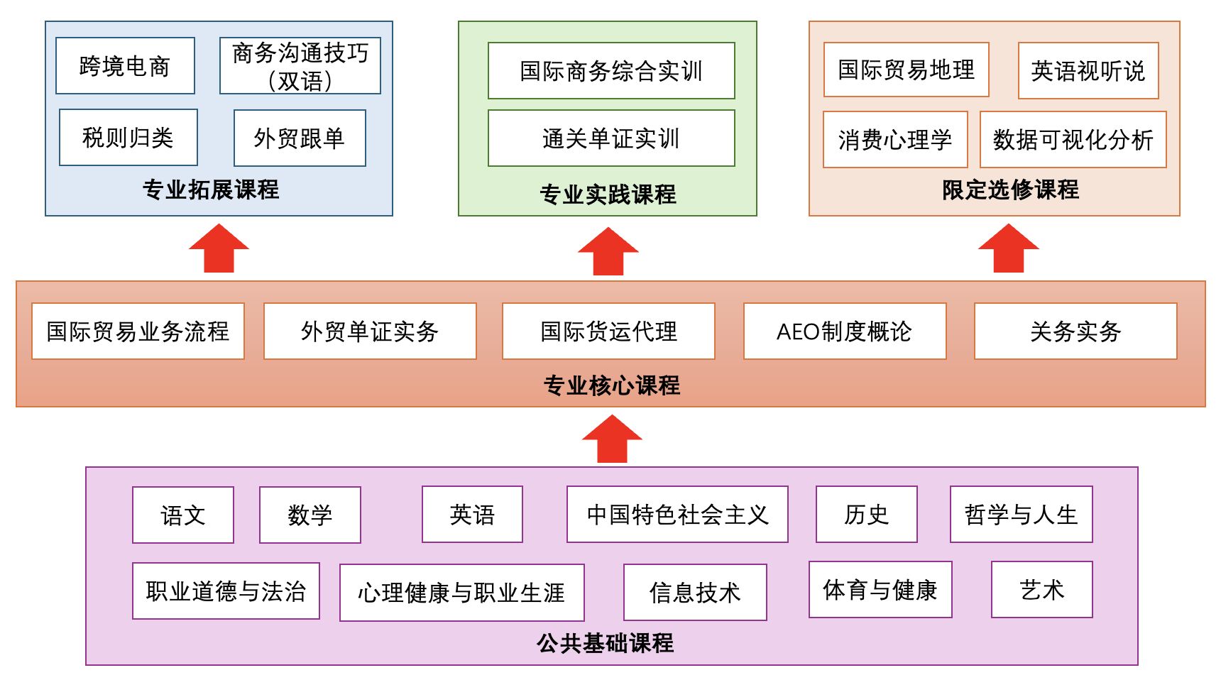 本专业立足于服务区域经济发展和企业对报关与国际货运人才的能力需要,依据行业企业用人标准,从职业岗位分析入手,将课程教学目标定位于岗位所需的职业核心能力,打造具备“四通一达”岗位能力人才的课程体系。专业证书有外经贸单证专业证书、报关水平测试、跨境电子商务多平台运营职业技能等级证书等。