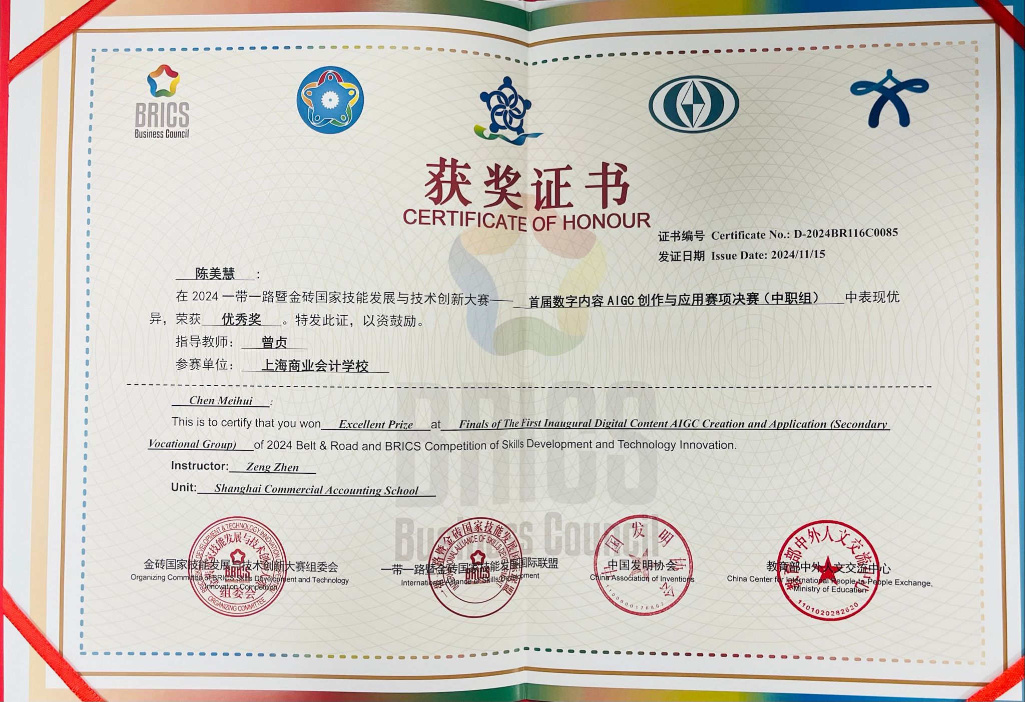 2024“一带一路”暨金砖国家技能发展与技术创新大赛首届数字内容AIGC创作与应用赛项国内总决赛(中职学生组)三等奖